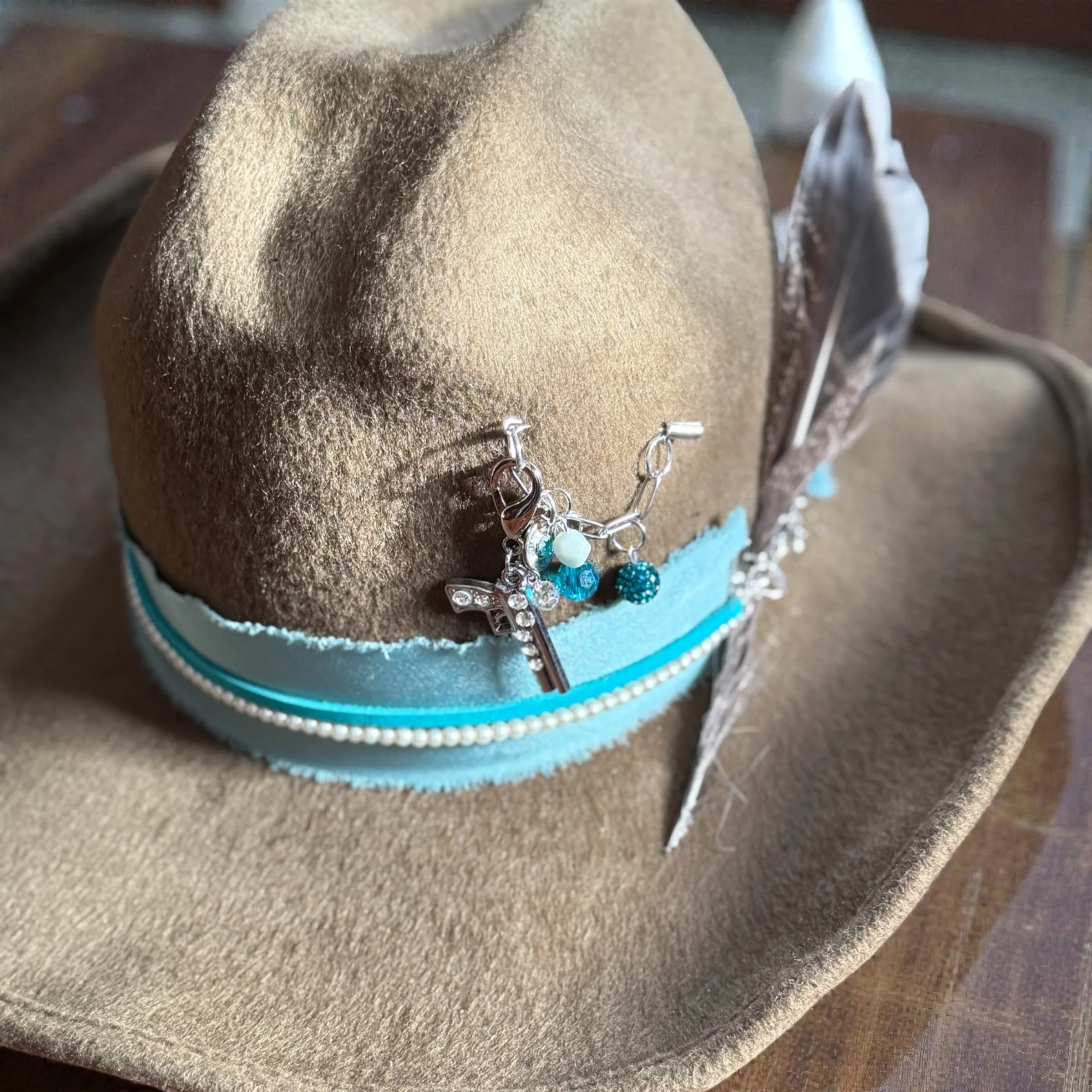 This is a MCGRAW hat in tobacco with The Sophisticated Hat Accessories including a Satin Hat Band, Pearl Layer, Leather Layer, Bullet & Bling Pin in Tropical Blue, all with Silver Accents and a Turkey Feather.